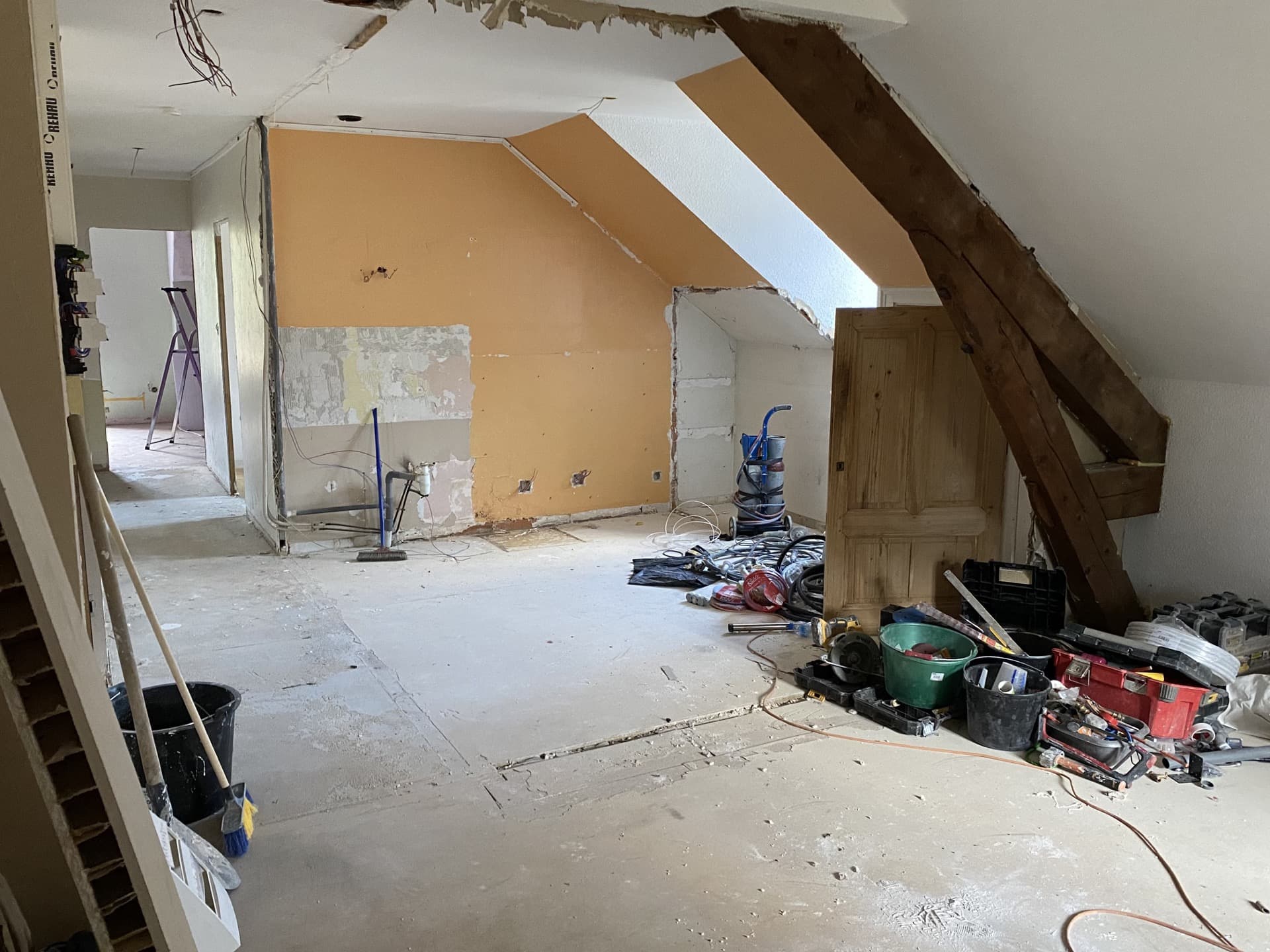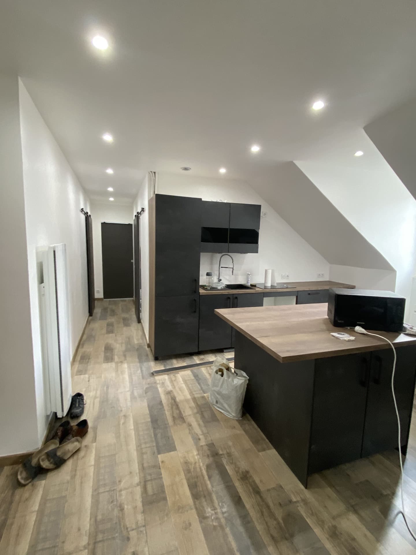 Nous sommes intervenus dans ce logement pour y poser une cuisine équipée tout confort, avec rénovation intégrale de l'ensemble: murs, sols, éclairage, arrivées et évacuations...