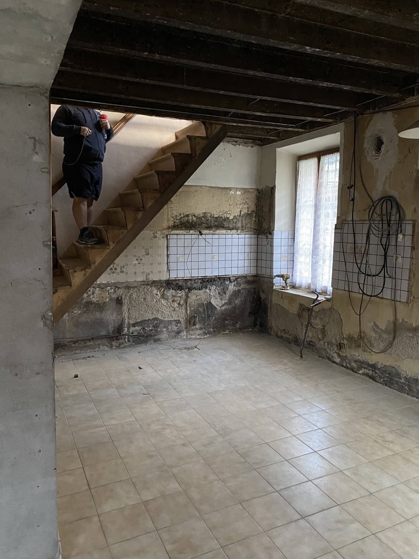 Nous avons mené un travail complet sur cette demeure: retrait d'un escalier avec fermeture de l'accès à l'étage supérieur, modification des fenêtres, remplacement du sol, réfection des murs, électricité, arrivées et évacuation et pose d'une cuisine équipée.